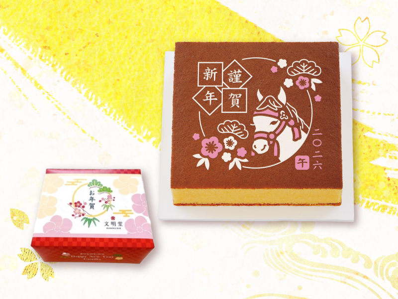 午が新年のご挨拶。お正月にぴったりの縁起の良い絵柄入りのカステラです。新春を飾るに相応しい紅白の色使いで贈り物にもおすすめ。特別に仕立てた、文明堂オリジナルカステラで新年に彩りを添えてください。