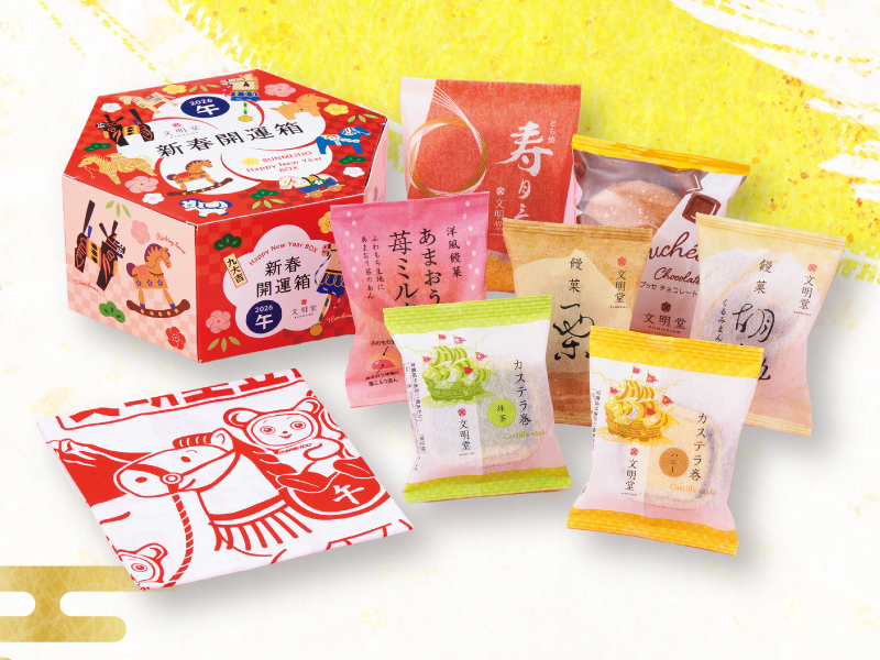 文明堂の人気商品、新春開運箱、OMカステラ干支1号の販売を2025年12月26日(金)から開始いたします。